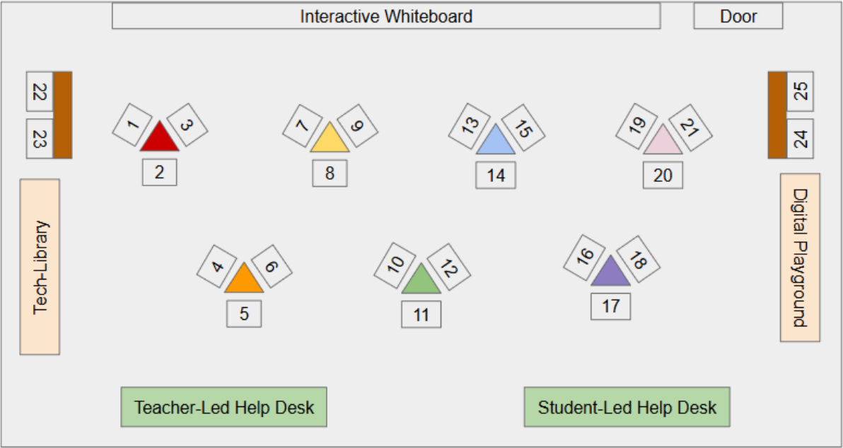 Each station has three desktop computers, matching rolling chairs, and a matching circle rug to visually define each zone. At the front of the room, an interactive whiteboard provides a dedicated area for teacher instruction. At the back of the room, two large areas for student and teacher-led help desks are available for students in the lab at the time. There is also a tech lending library for at-home use and a digital playground cart with items for free choice time or indoor recess.